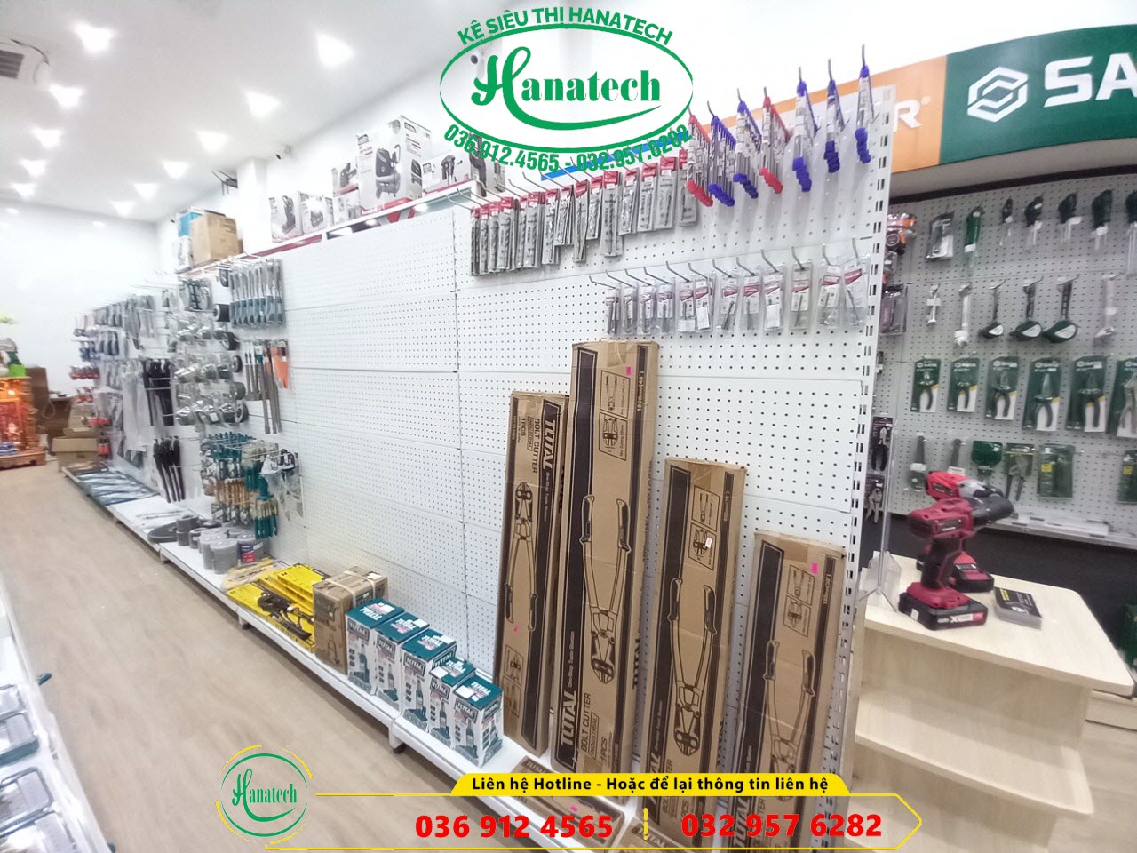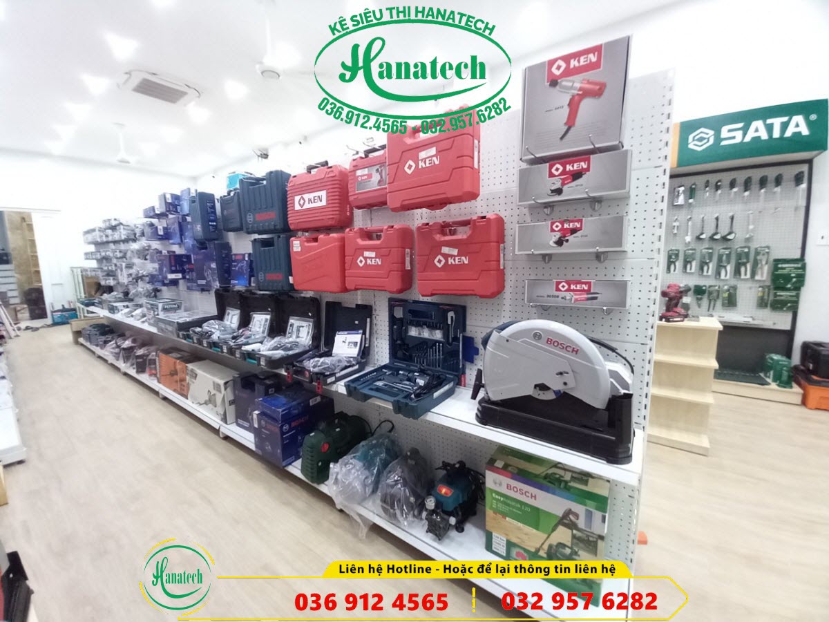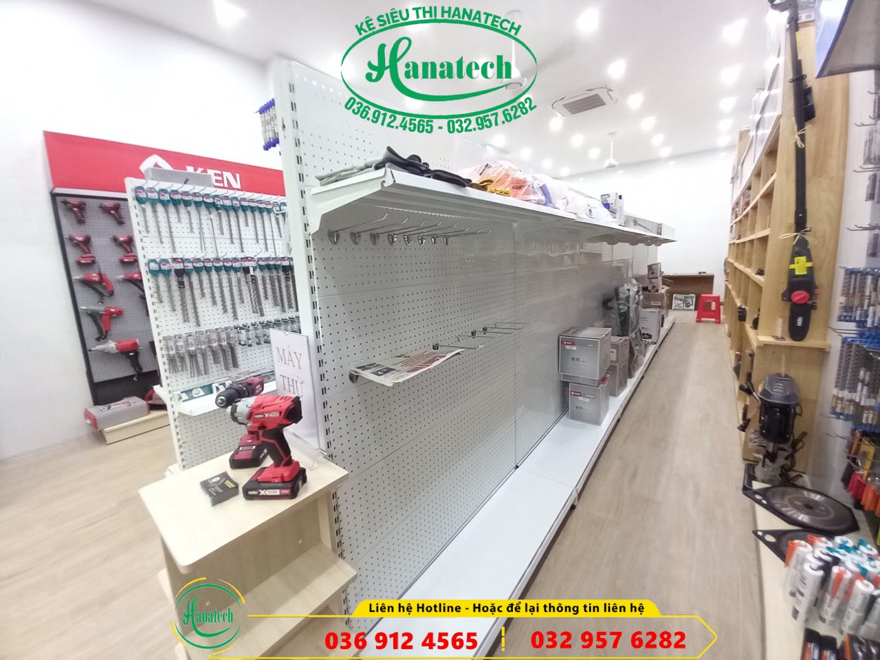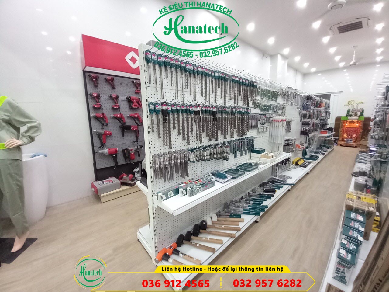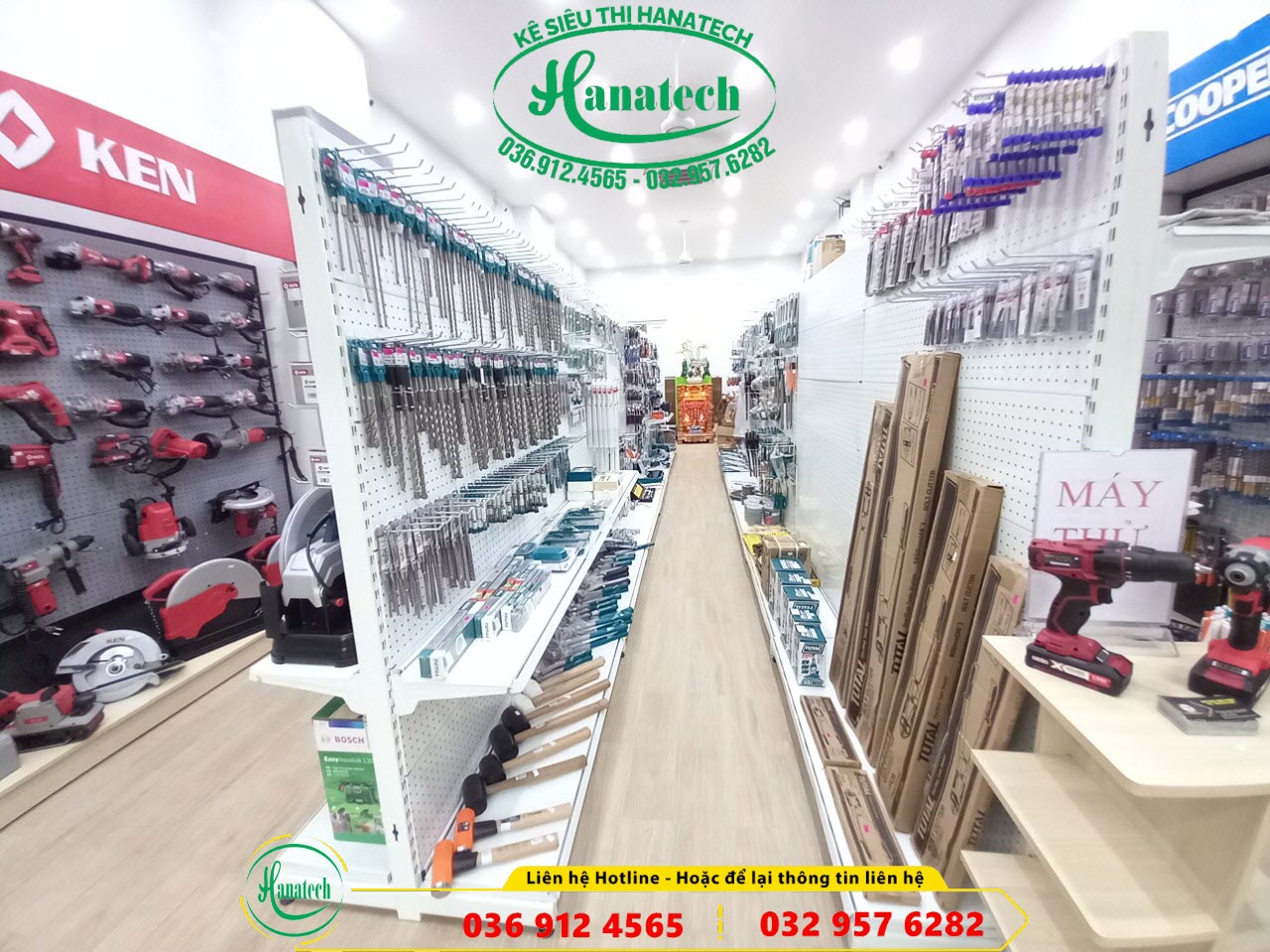 Mẫu kệ này của Hanatech cực kỳ phù hợp với các mô hình cửa hàng và siêu thị chuyên kinh doanh các sản phẩm thiết bị xây dựng, cơ khí, bảo hộ lao động. Sử dụng hoàn toàn mẫu giá kệ siêu thị trưng bày sản phẩm loại : TÔN ĐỤC LỖ kết hợp MÓC TREO. Các tư vấn và kỹ thuật viên của Hanatech chúng đã tư vấn, thiết kế và setup trọn gói cửa hàng cho khác hàng và mang tới sự hài lòng nhất cho khách hàng với các loại kệ như :