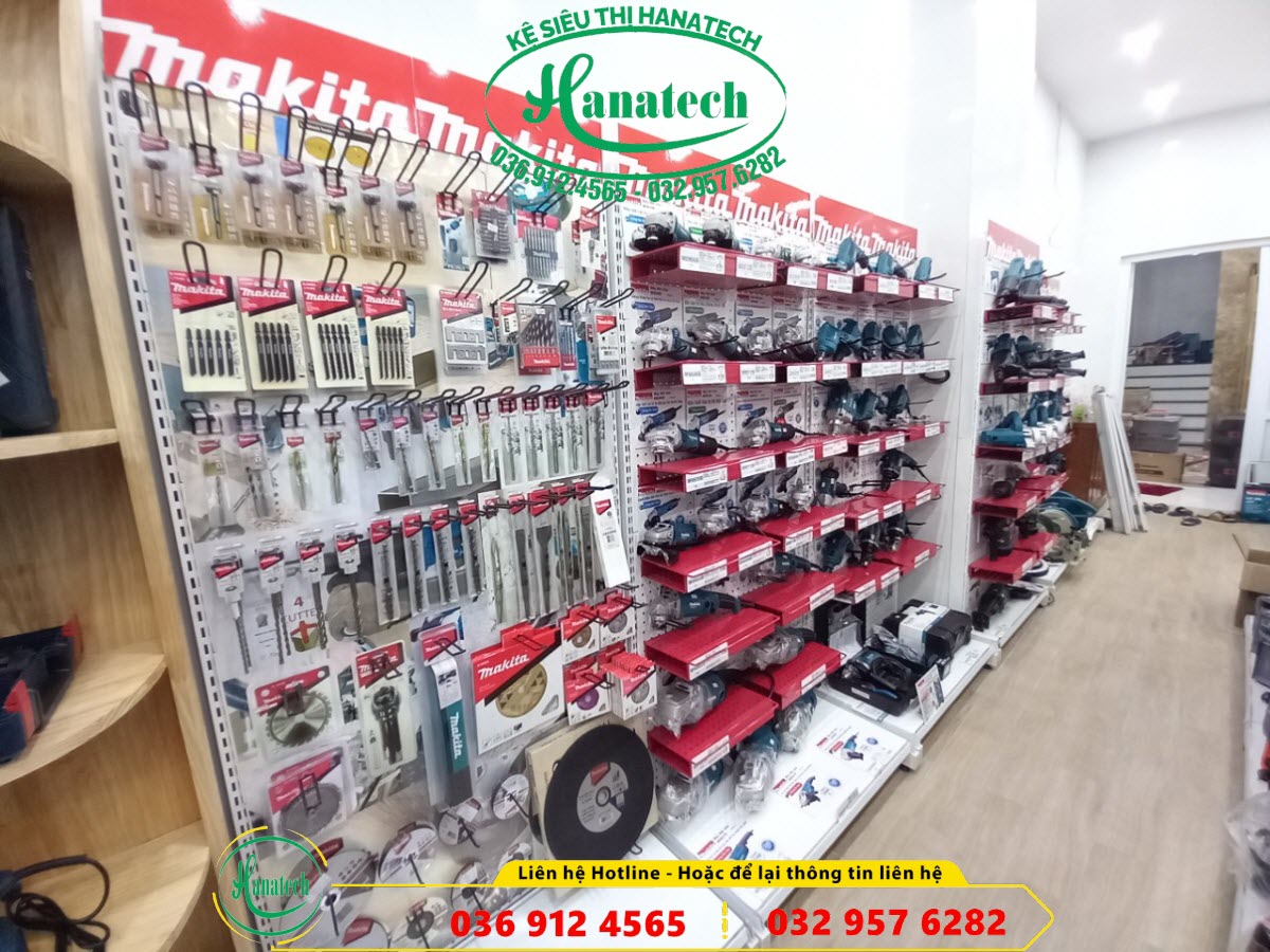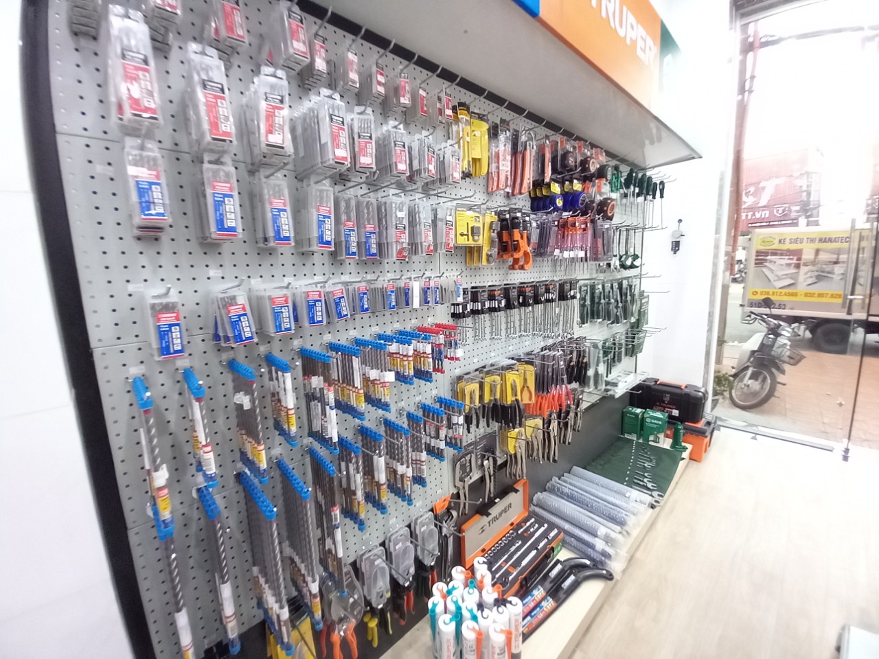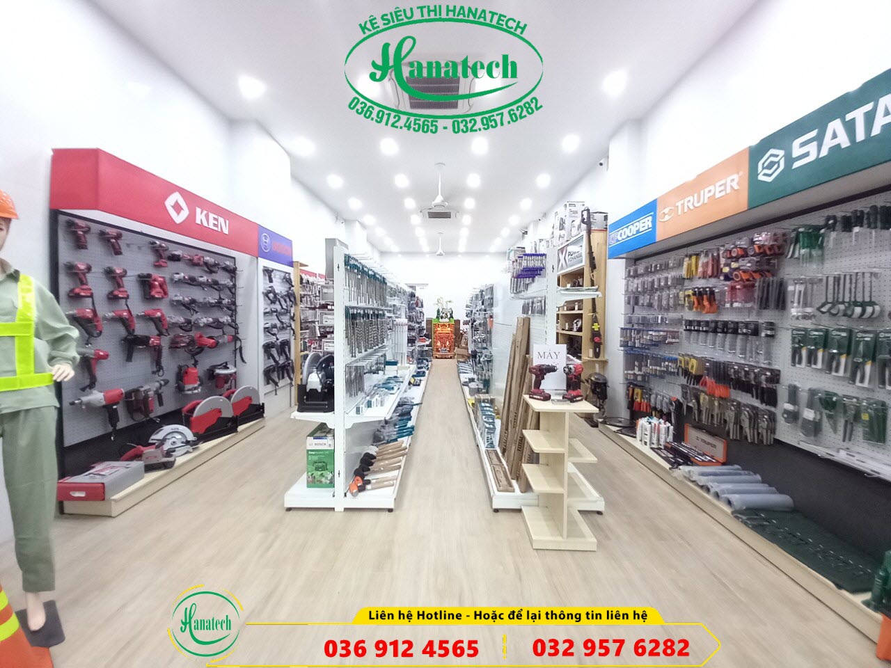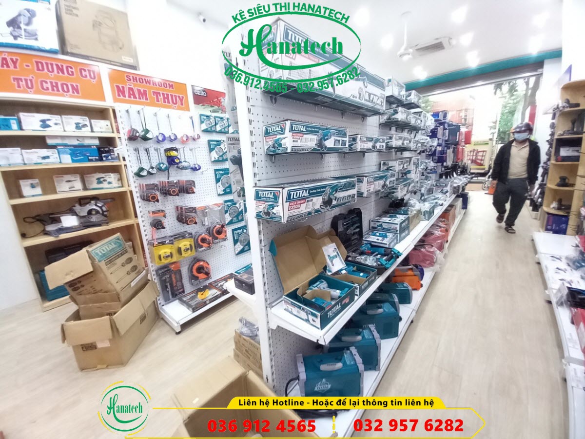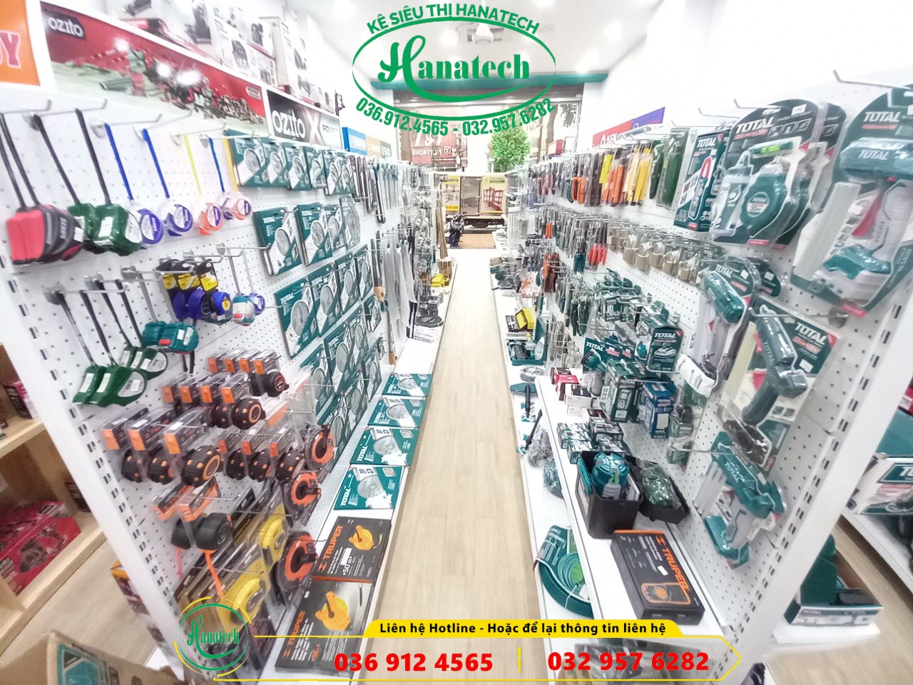 Mẫu kệ này của Hanatech cực kỳ phù hợp với các mô hình cửa hàng và siêu thị chuyên kinh doanh các sản phẩm thiết bị xây dựng, cơ khí, bảo hộ lao động. Sử dụng hoàn toàn mẫu giá kệ siêu thị trưng bày sản phẩm loại : TÔN ĐỤC LỖ kết hợp MÓC TREO. Các tư vấn và kỹ thuật viên của Hanatech chúng đã tư vấn, thiết kế và setup trọn gói cửa hàng cho khác hàng và mang tới sự hài lòng nhất cho khách hàng với các loại kệ như :