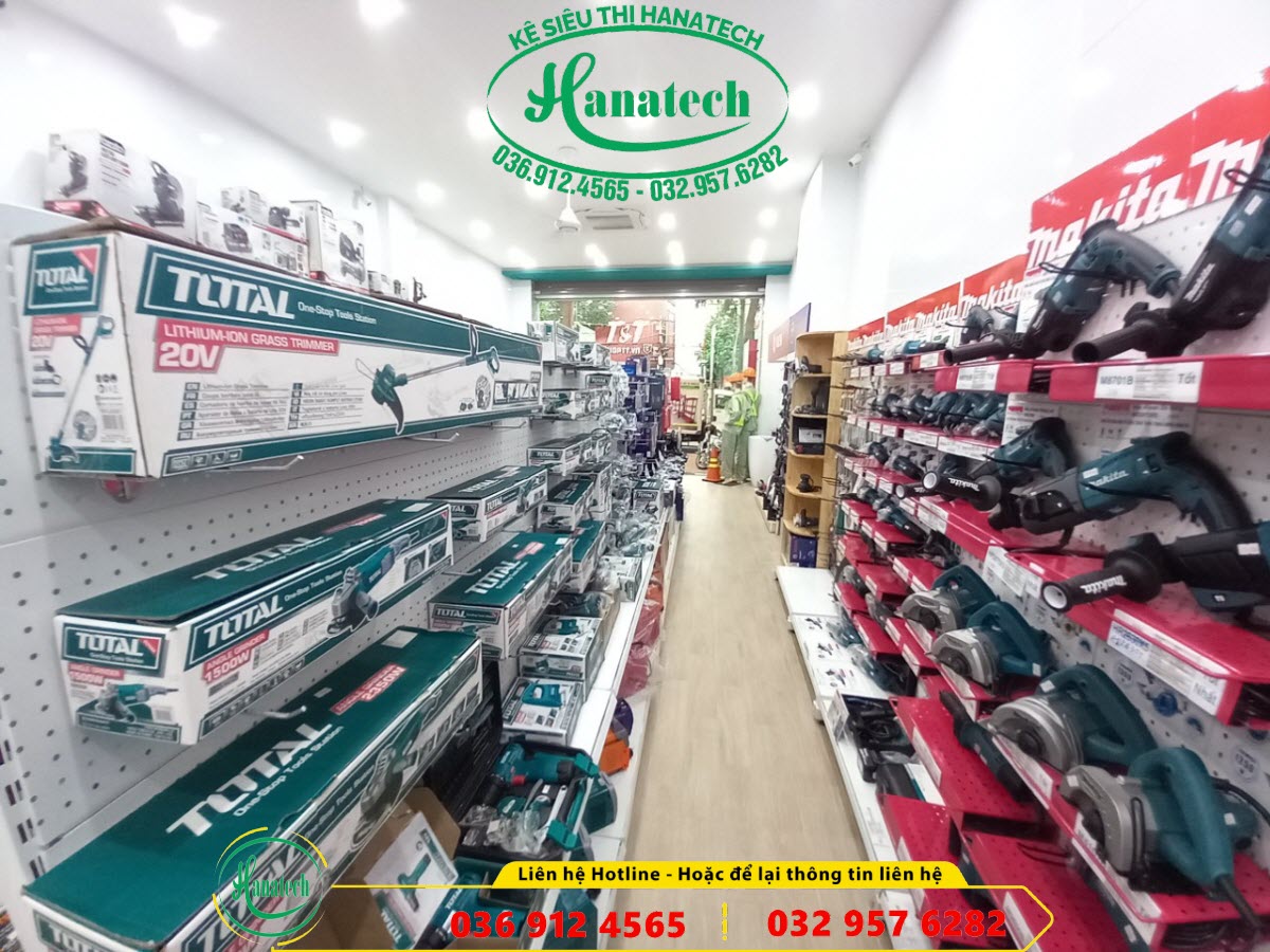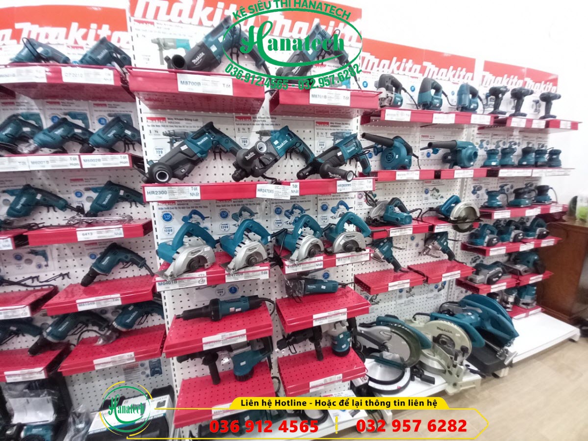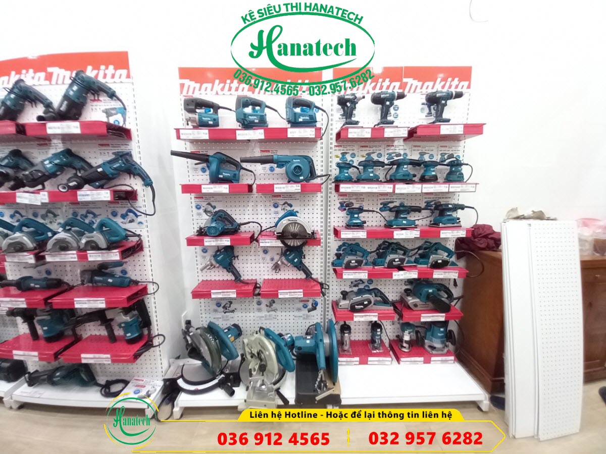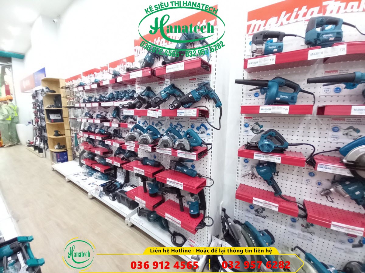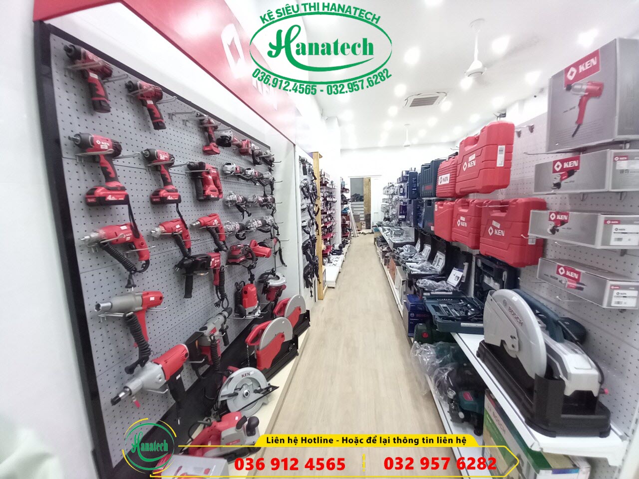 Mẫu kệ này của Hanatech cực kỳ phù hợp với các mô hình cửa hàng và siêu thị chuyên kinh doanh các sản phẩm thiết bị xây dựng, cơ khí, bảo hộ lao động. Sử dụng hoàn toàn mẫu giá kệ siêu thị trưng bày sản phẩm loại : TÔN ĐỤC LỖ kết hợp MÓC TREO. Các tư vấn và kỹ thuật viên của Hanatech chúng đã tư vấn, thiết kế và setup trọn gói cửa hàng cho khác hàng và mang tới sự hài lòng nhất cho khách hàng với các loại kệ như :