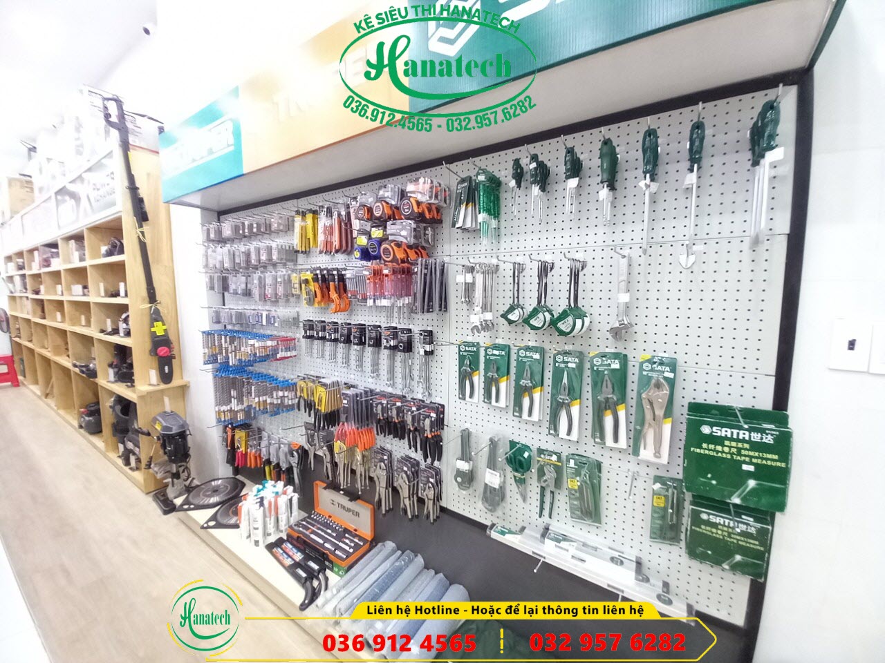 Dưới đây, mời quý khách tham khảo hình ảnh chi tiết mẫu cửa hàng siêu thị sử dụng giá kệ móc treo dụng cụ cầm tay mà Hanatech chúng tôi vừa lắp đặt :