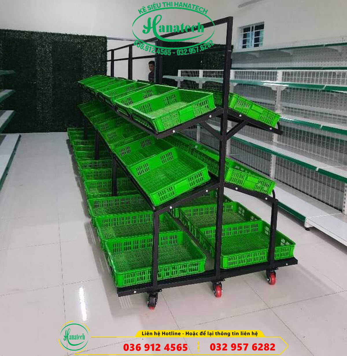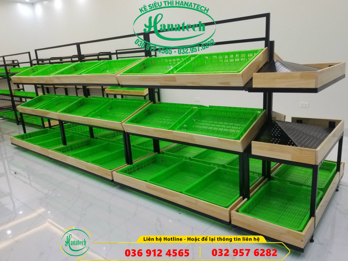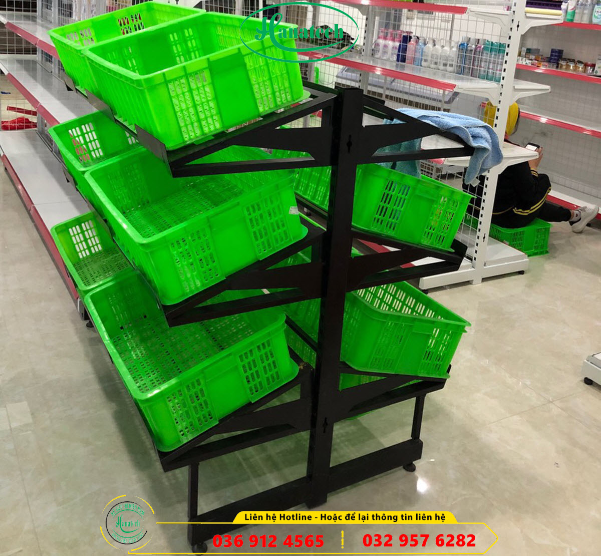 Mẫu kệ trái cây rau củ quả này hoàn toàn khác biệt so với các mẫu kệ thông thường, với thiết kế khung sắt tĩnh điện chắc chắn, kết hợp giỏ nhựa chứa hàng hoặc giỏ gỗ thông đã qua xử lý, mang tới cho cửa hàng một mẫu kệ vừa trưng bày sản phẩm, vừa có thể bảo quản hàng hóa cực tốt.