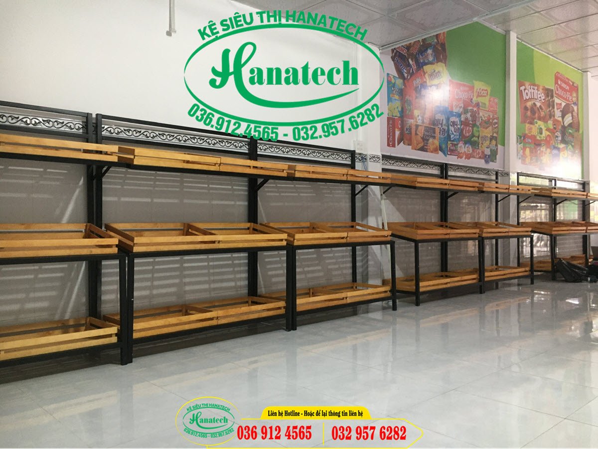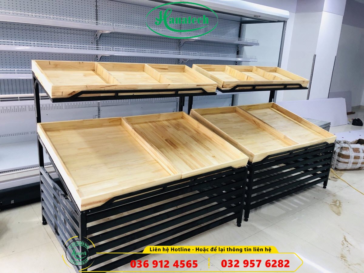 Kệ siêu thị mâm gỗ là mẫu giá kệ siêu thị trưng bày đặc biệt và cao cấp do Hanatech chúng tôi trực tiếp thiết kế, sản xuất và thi công lắp đặt trọn gói. Đây sẽ là mẫu giá kệ trưng bày sản phẩm mang tới sự khác biệt cho không gian trưng bày sản phẩm của quý khách . Mâm trưng bày bằng gỗ kết hợp với khung kệ siêu thị sẽ mang tới sự sang trọng, đẳng cấp, thẩm mỹ và nâng tầm thương hiệu của quý khách hàng.